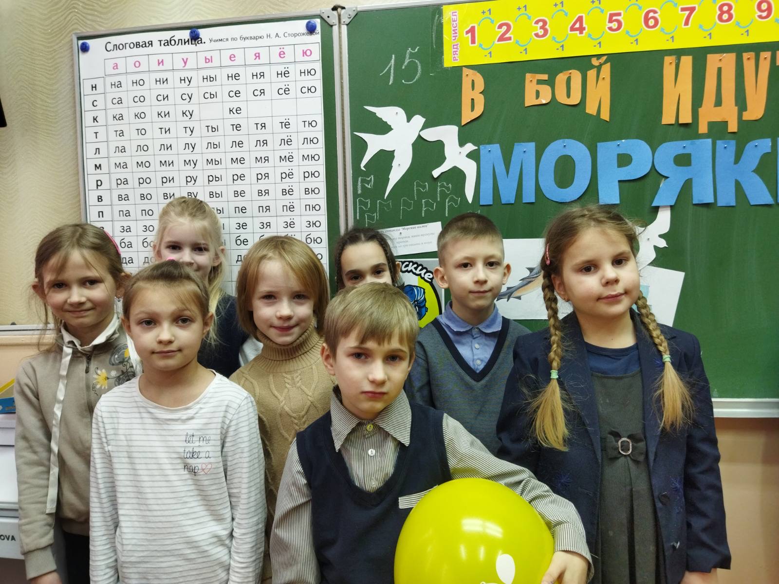 Для малышей из 1 классов прошла конкурсно – познавательная игра «В бой идут моряки».Каждый смог показать, на какие подвиги он готов. Вся программа проводилась в форме соревнования между двумя командами. Будущим защитникам были предложены конкурсы на морскую тематику. Команды прошли через все испытания морской жизни: теоретические знания, морские учения, физподготовку. За победу в испытаниях-конкурсах ребята получали призовые баллы, которые приближали их к победе. Все юные моряки старались получить высокие оценки и убедили всех в том, что они настоящие защитники, способные проявить смелость, находчивость и смекалку. Представляя себя настоящими моряками, ребята с удовольствием приняли участие в конкурсах. В ходе мероприятия дети сделали вывод, что быть защитником Отечества- важно и почётно. Верность долгу, самоотверженность, честь, доблесть, порядочность, самодисциплина, беспрекословное подчинение приказу старших по званию — вот традиции всех воинов. Именно эти традиции чтили и по-настоящему дорожили ими наши отцы и деды, прошагавшие огненными дорогами войны. И сегодня подрастающее поколение юных защитников обязано равняться на этих достойных людей. Дети соревновались не только в ловкости, меткости и умении чётко выполнять приказы. Им пришлось также проявить смекалку, задействовать логическое мышление и внимание, составляя и разгадывая шифры, продемонстрировать свой кругозор и начитанность, составляя пословицы и отвечая на хитрые вопросы. В конце занятия будущие защитники Отечества получили сладкие подарки и сувениры.