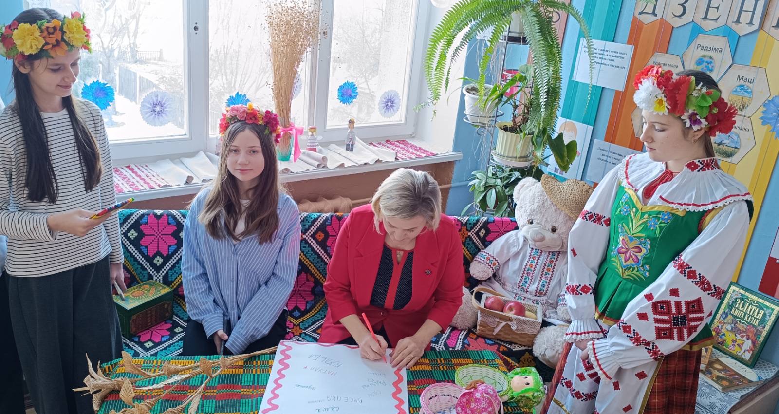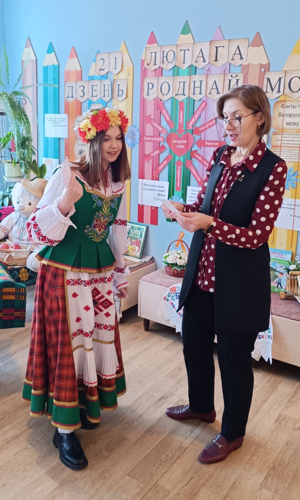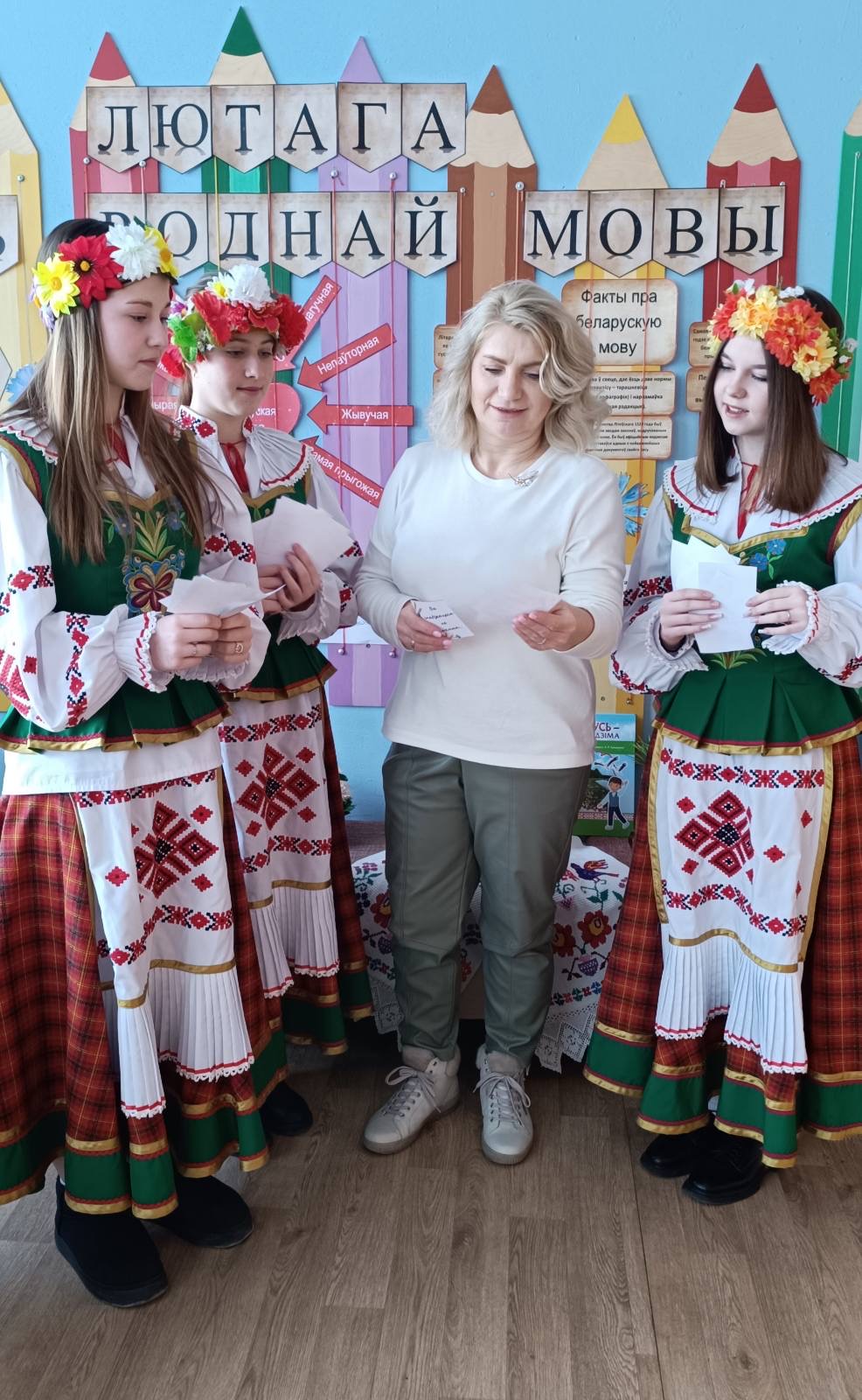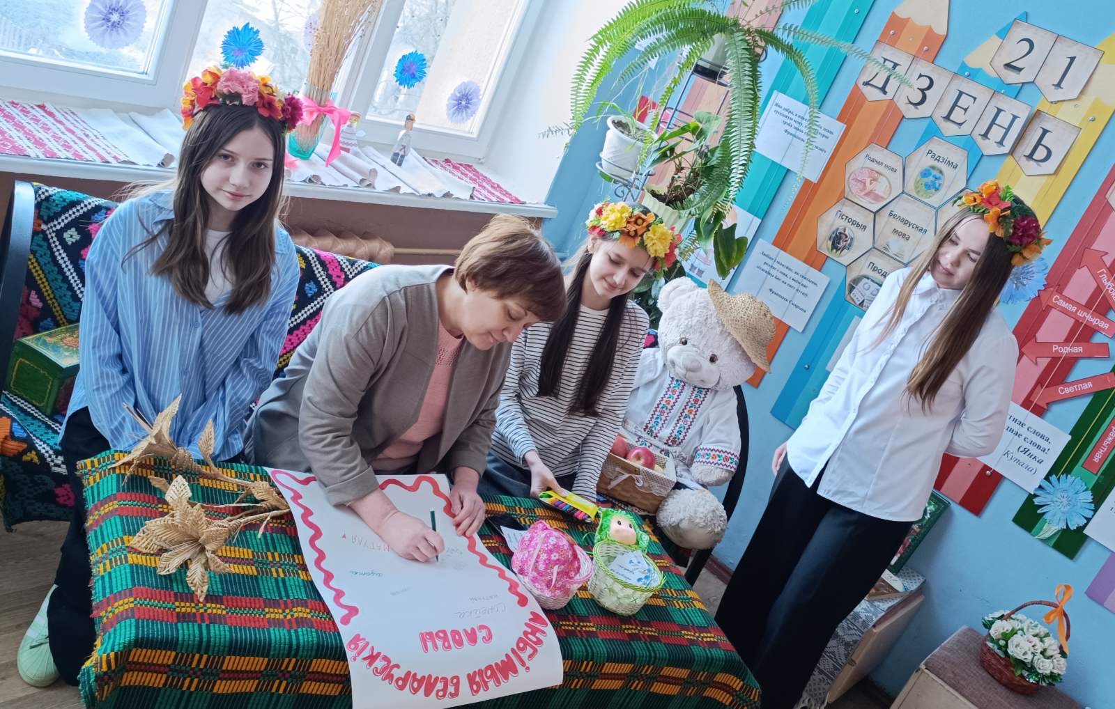 21 лютага з самай раніцы ў нашай школе панаваў святочны настрой. Прыгажуні дзяўчаты ў нацыянальных касцюмах сустракалі вучняў і настаўнікаў і прапаноўвалі далучыцца да акцыі “Размаўляем па-беларуску”. Вучаніцы 7″А” класа павіншавалі вучняў школы і расказалі гісторыю ўзнікнення свята. Увесь дзень на перапынках гучалі звонкія песні на роднай мове. Дзеці і дарослыя з задавальненнем прынялі ўдзел у акцыях “Збяром букет разам” і ” Маё любімае беларускае слова”. Яркім момантам святочнага дня стаў вясёлы карагод пад гучанне знаёмай усім “Купалінкі”. А яшчэ кожны мог даведацца, што яго чакае ў бліжэйшы час, атрымаўшы параду-пажаданне з нагоды Міжнароднага Дня роднай мовы.