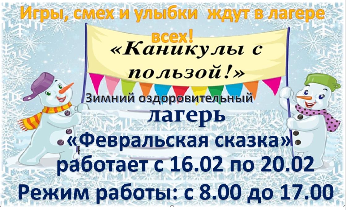 В период дополнительных зимних каникул с 16.02 по 20.02.26 г. на базе нашей школы будет работать оздоровительный лагерь с дневным пребыванием “Февральская сказка”. Яркими, весёлыми, полезными и запоминающимися эти каникулы станут для девчонок и мальчишек 1-2 классов.