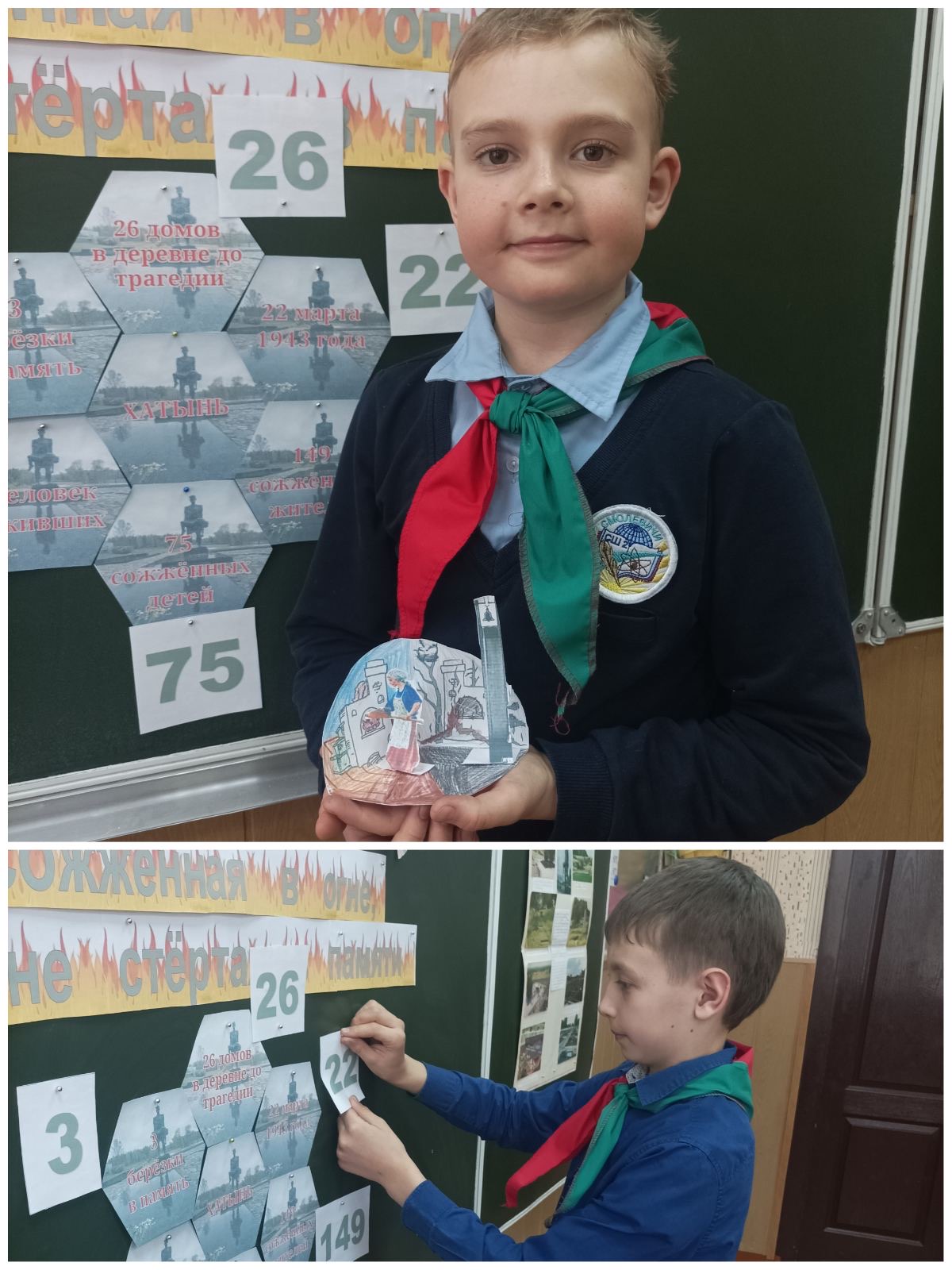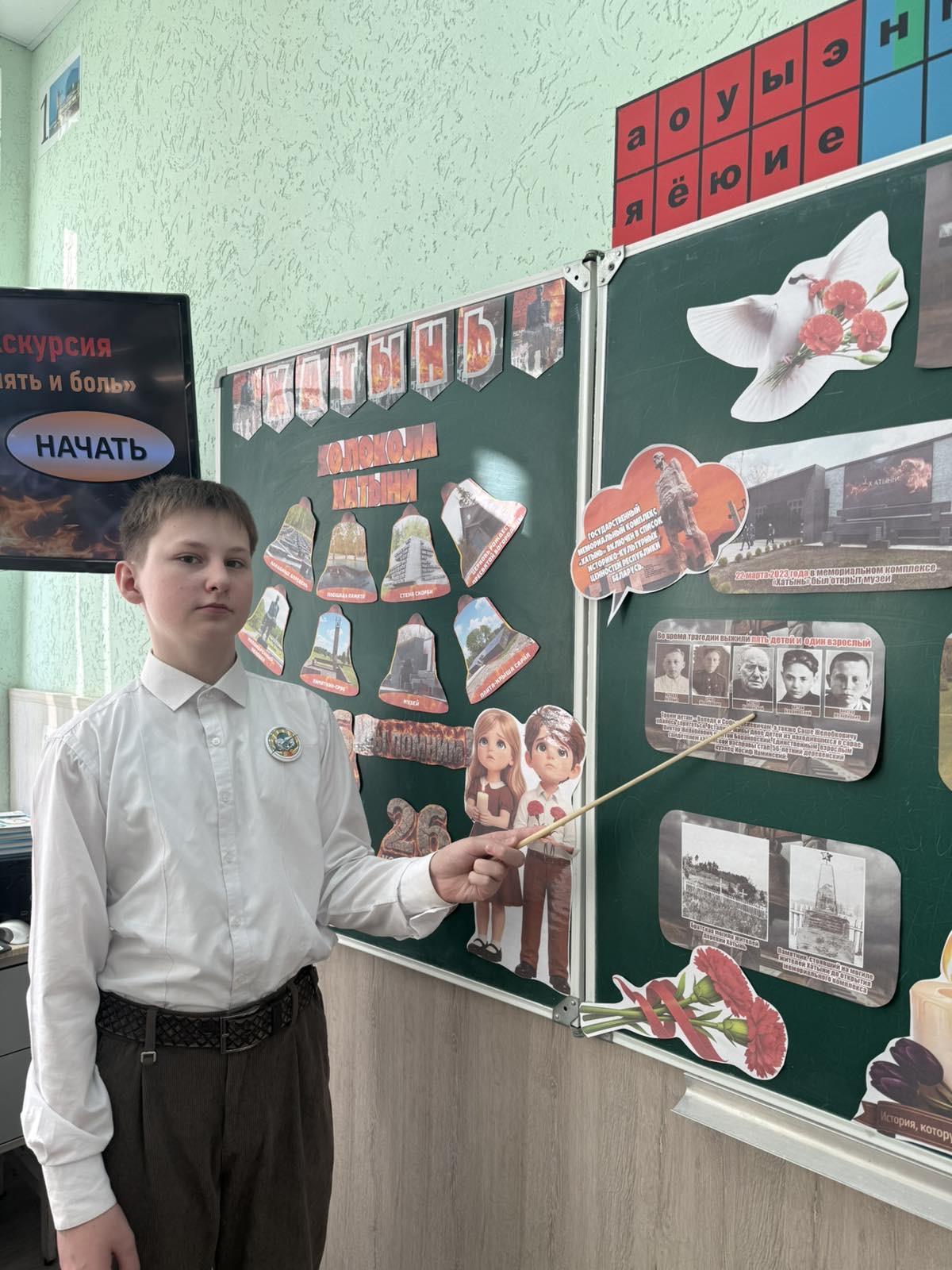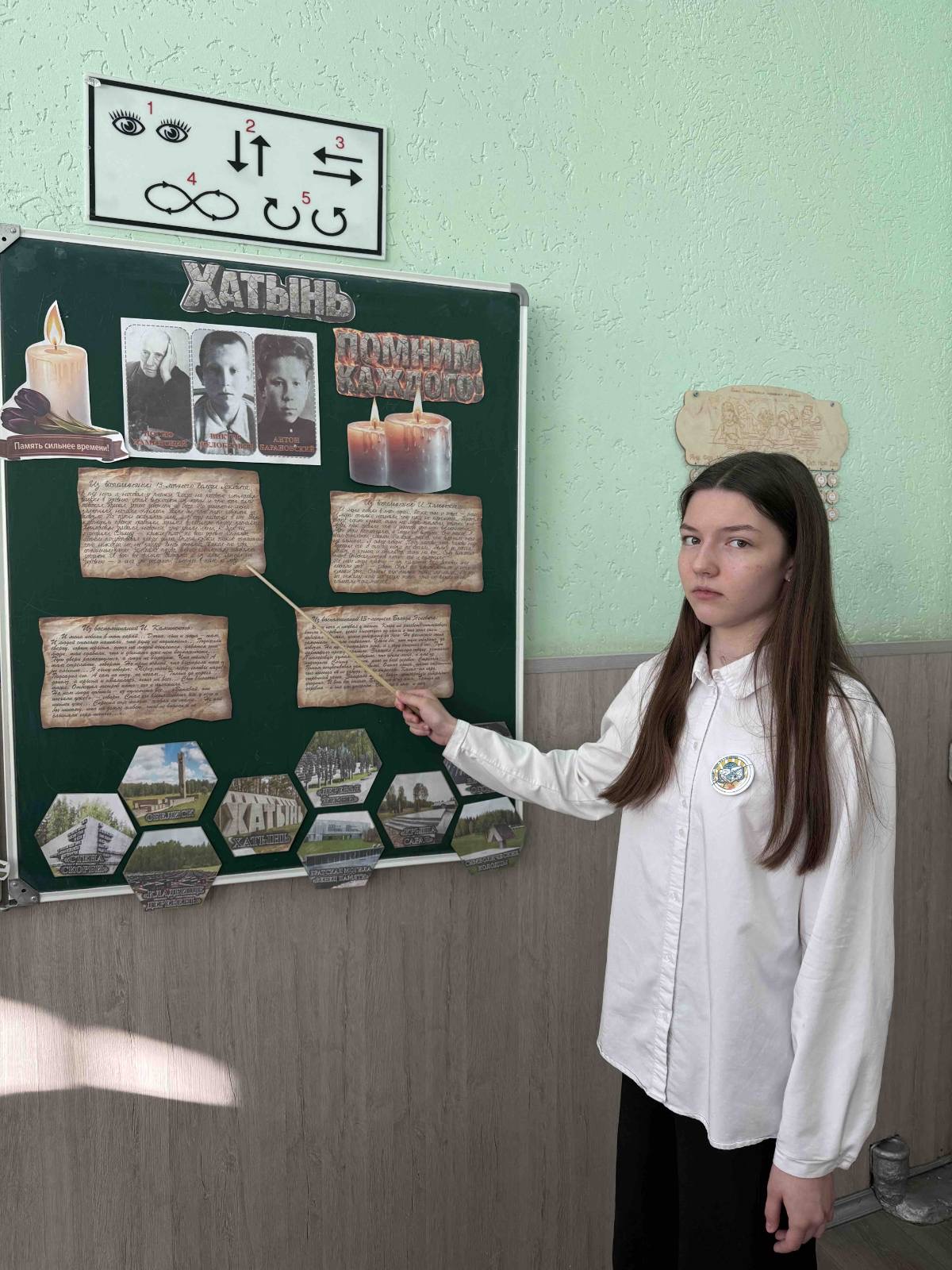 Ребята посмотрели документальную хронику, прочитали отрывки из воспоминаний очевидцев и почтили память погибших минутой молчания, прочитали стихи и послушали песни, посвященные Хатыни. Говорили о том, что Хатынь — это не просто история одной деревни. Это символ всех сожженных деревень Беларуси.